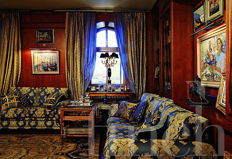 Эта квартира в ЖК «Опера Хаус» — 205 квадратных метров роскоши и шика. Великолепнейший дизайнерской ремонт придётся по нраву любителям классики в английском стиле. В отделке интерьера использовано много натурального дерева дорогих пород тёмных оттенков: двери, стеновые панели, паркет, мебель и прочие предметы интерьера. Мягкая мебель также выполнена в английском стиле и соответствует лучшим образцам, пожалуй, викторианской эпохи. Немалую роль во всём этом антураже играют изысканные люстры, бра, настольные лампы, а также текстиль — дорогие тяжелые портьеры, узорчатые ковры.