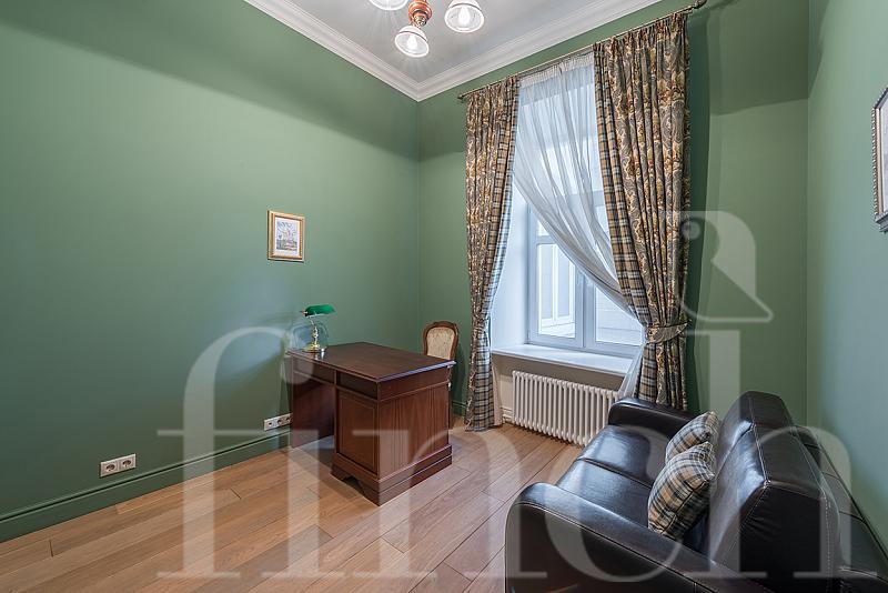 Вся мебель в квартире — ручной работы, и выполнена из натурального дерева. Окна выходят в тихий переулок и во двор. Потолки высотой 3,6 м.