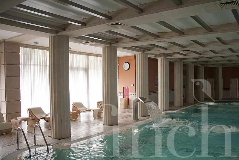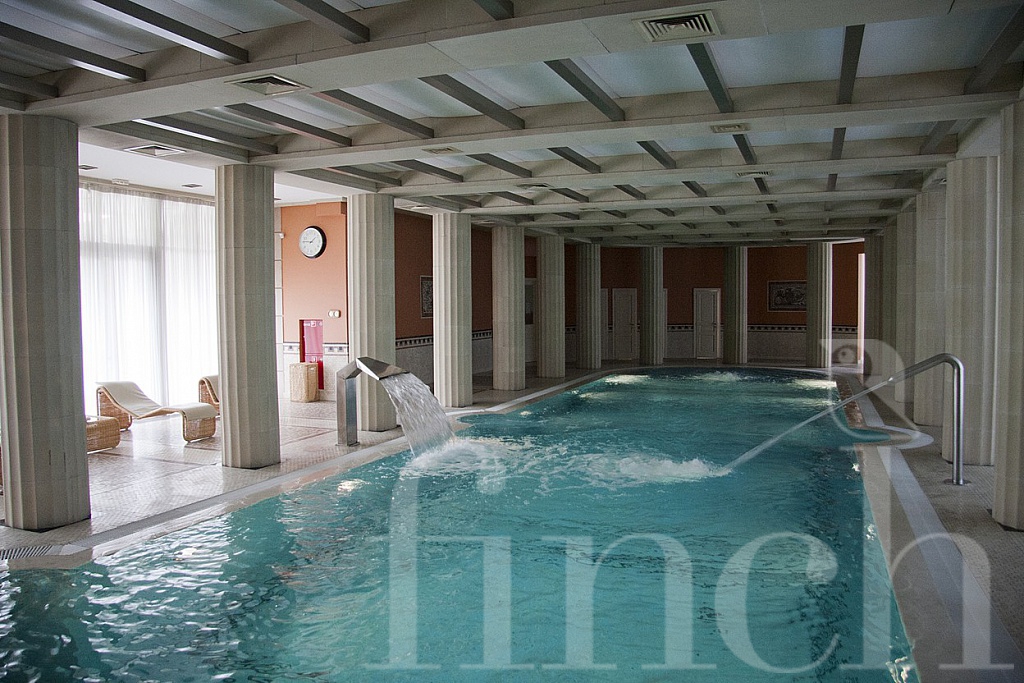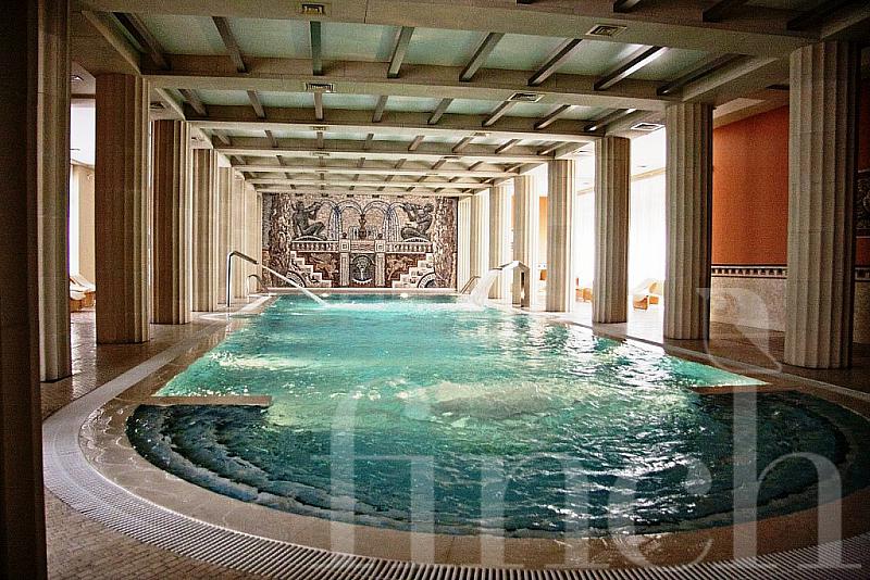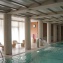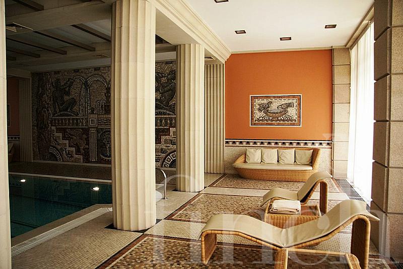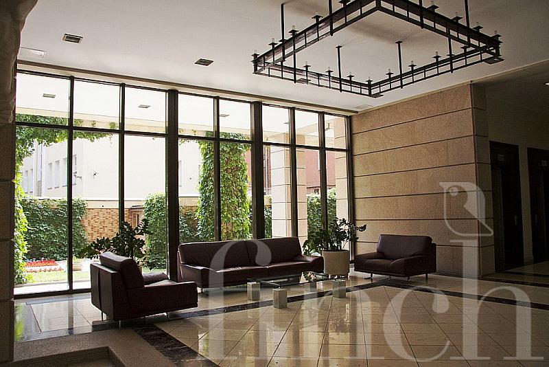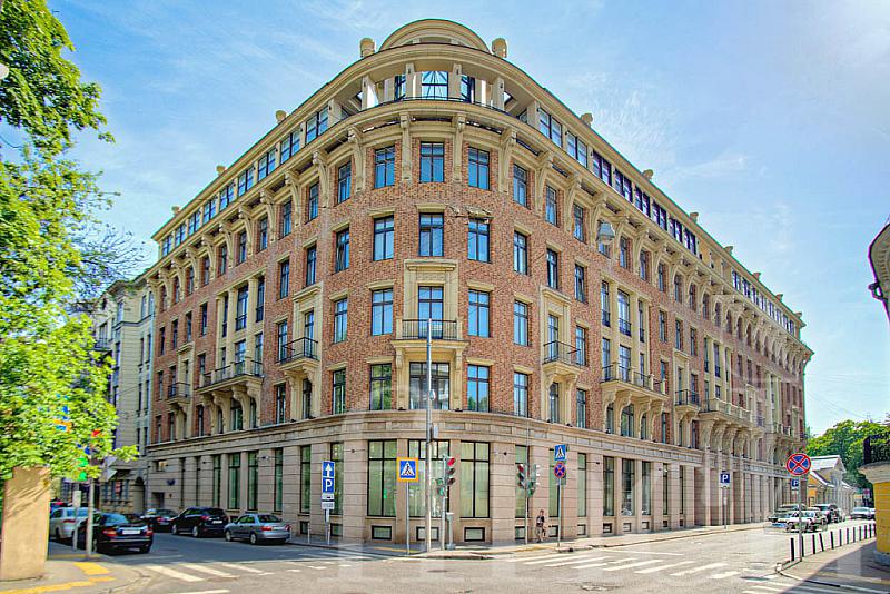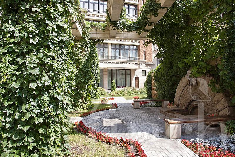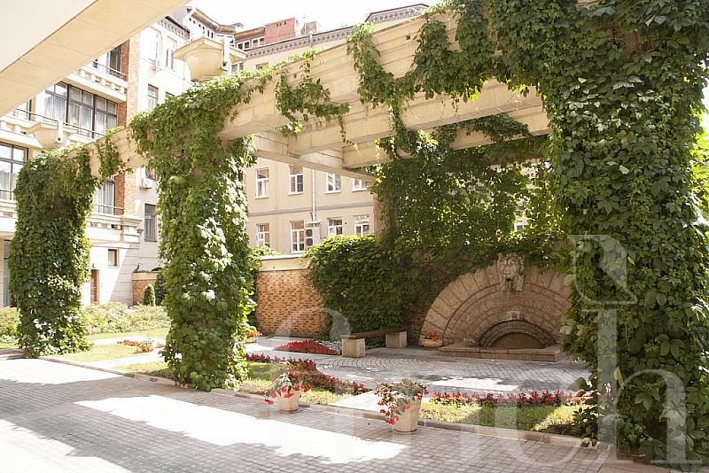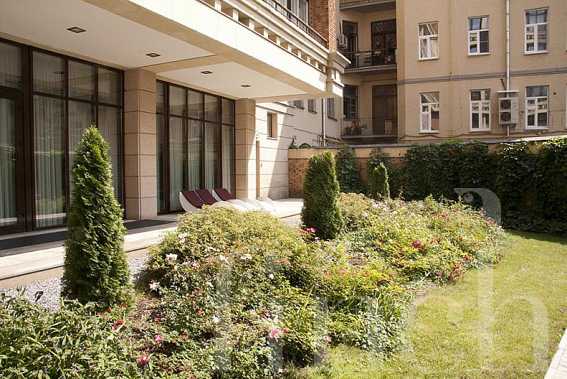 Входная группа и зоны общественного пользования отделаны также в неоклассическом стиле. Здесь продолжается тема лепнины и натурального камня — полы покрыты гранитом и мрамором. Отдельно стоит рассказать о бассейне для жильцов дома. Он напоминает древние греко-римские купели — мозаичный пол, колонны, фрески и панно на стенах. На мысль о тех же временах и местах наводит и чудесный внутренний двор. Здесь очень много зелени, цветов, всё увито плющом и диким виноградом как в старинных итальянских двориках. Выйдя сюда, в это тихое и уютное место, и взглянув на «римский» фонтан и перголы, покрытые растительностью, Вы забудете, что живёте в центре Москвы. Из прочих удобств есть подземная парковка, тренажерный зал, баня, комната для водителей. Дом находится под круглосуточной охраной и видеонаблюдением.