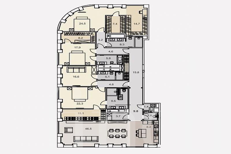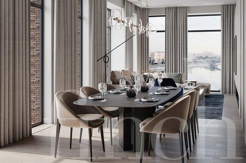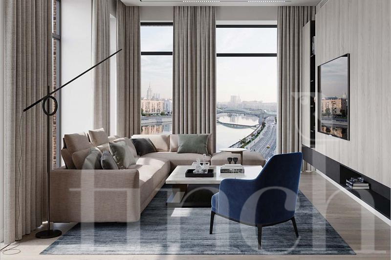 Просторная светлая квартира с отделкой от застройщика в классическом стиле. 4 спальни, 3 гардеробных комнаты. Панорамные виды на набережную.