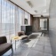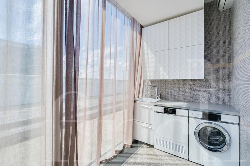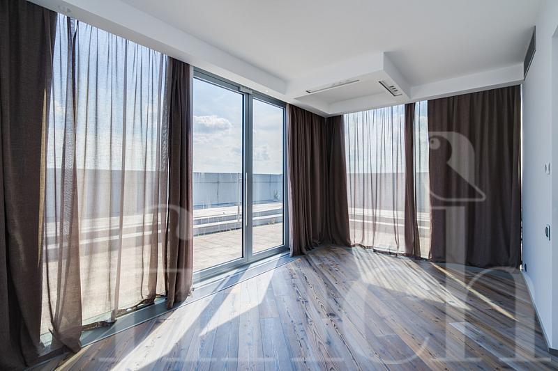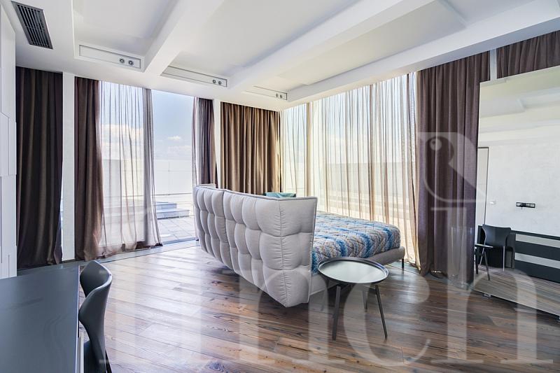 Пентхаус занимает 2 уровня, планировка идеальная — всё продумано, комнаты просторные и свободные. Так, на 1-м уровне расположена совмещённая гостиная-кухня-столовая, из которой есть отдельный выход в лифтовый холл и на террасу, а также спальня с гардеробом и спа-зоной, в которой есть сауна и хамам с тропическим душем. Из спа-зоны также есть выход на террасу. На 2-м уровне — видовой кинозал с панорамными окнами по трём сторонам (с востока по северо-запад), и видовая спальня с гардеробом, тропическим душем и ванной, и с панорамными окнами, расположенными с востока по юго-запад. В пентхаусе есть также и кабинет, который вместе с прихожей и гостевым санузлом можно отделить от остальной квартиры при помощи специальной дизайнерской сдвижной перегородки из вспененного алюминия. Из кабинета есть выход на террасу. Для бытовых нужд в пентхаусе предусмотрена постирочная комната, с огромным окном, оборудованная техникой ZUG, Miele.