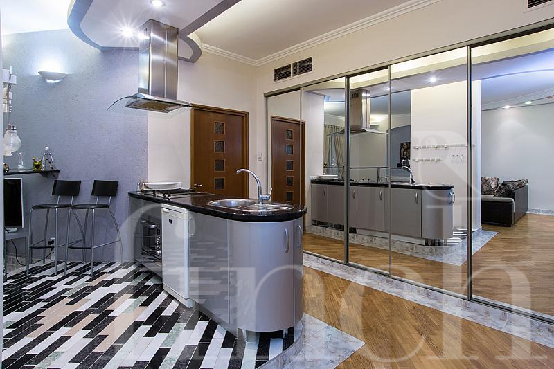 Особенно интересна кухня. Она выполнена в форме небольшого, но очень функционального островка, в котором есть всё, чтобы готовить с удовольствием. Традиционно оформлена только спальня — здесь песочного цвета стены и мебель из натурального коричневого дерева.