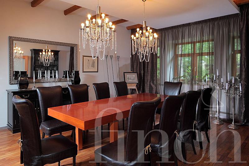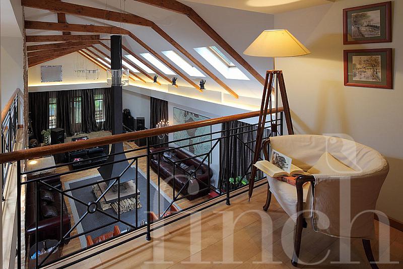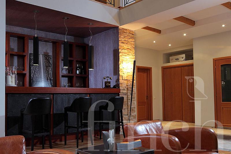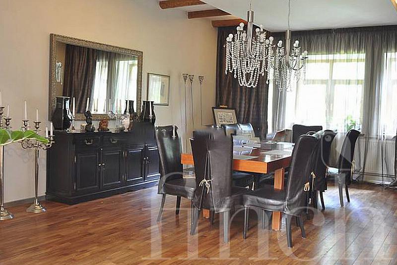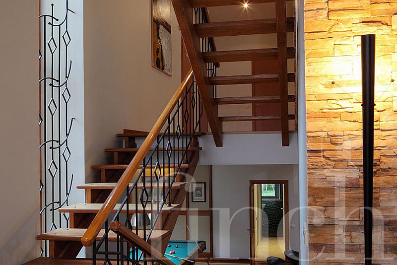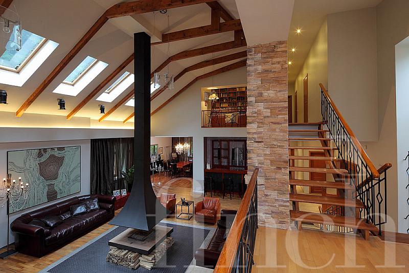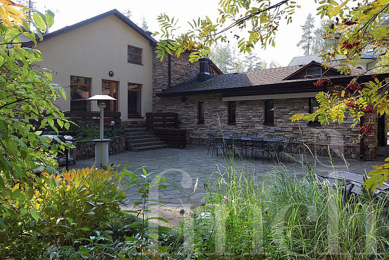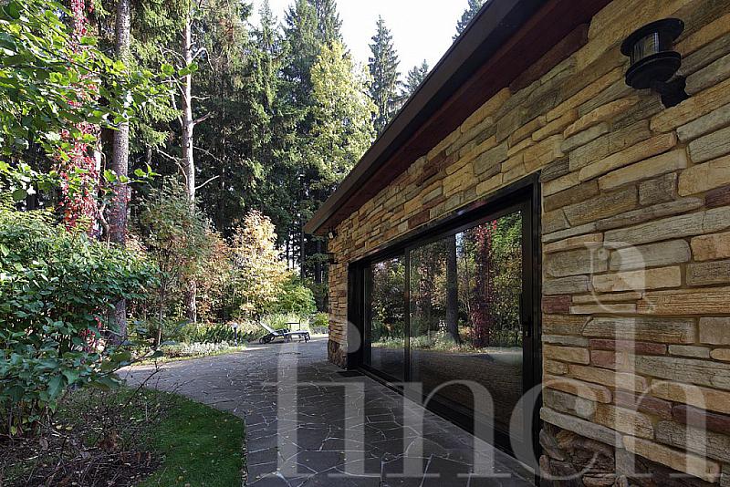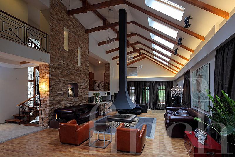 На цокольном этаже располагаются все бытовые помещения — постирочная, подсобка, кладовки. В доме выполнен ремонт в современном стиле — натуральное дерево и камень в отделке, обитая кожей мебель.