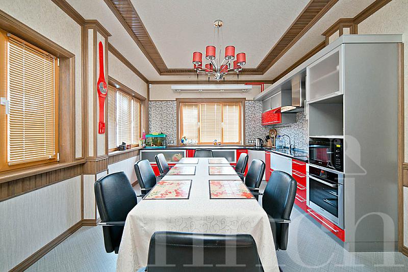 Дом большой — 650 кв.м — и вполне подходит не только для летнего или зимнего отдыха, но и для круглогодичного проживания. Пять санузлов и 4 спальни устроят даже очень большую семью. Также в доме есть холл и прихожая, кабинет, две гардеробные, кухня, совмещённая со столовой, гостиная со вторым светом, в которой устроен камин.