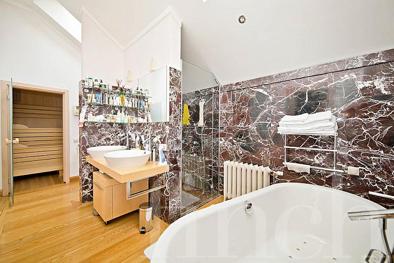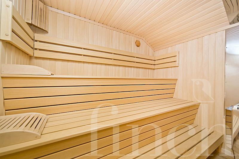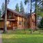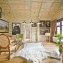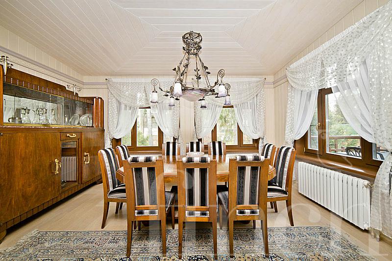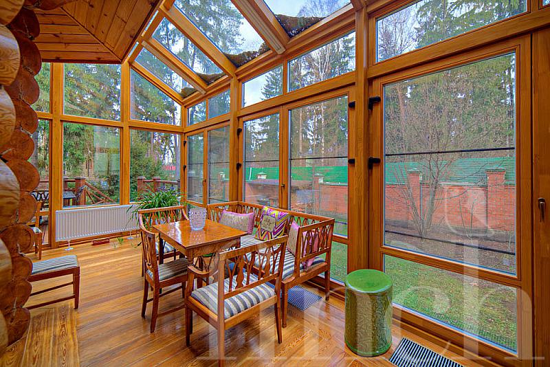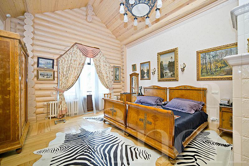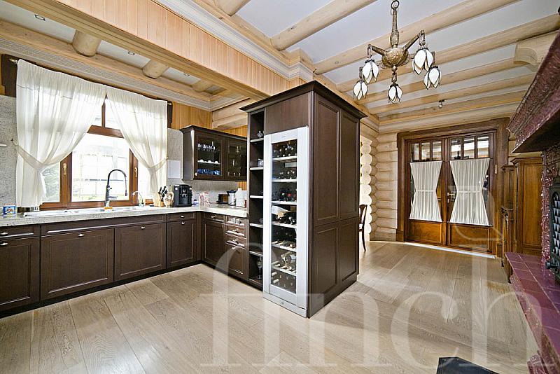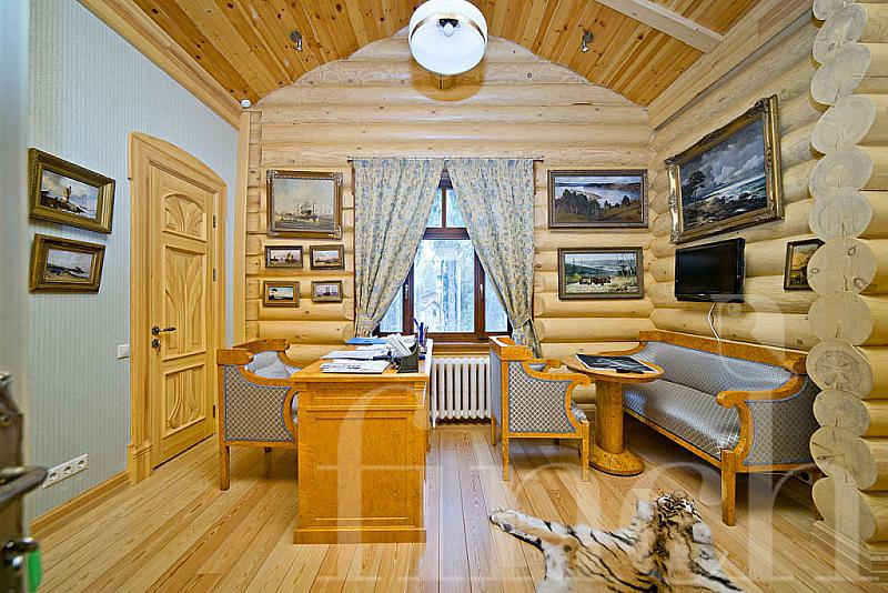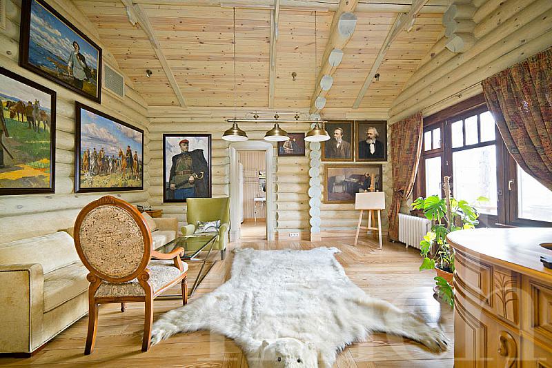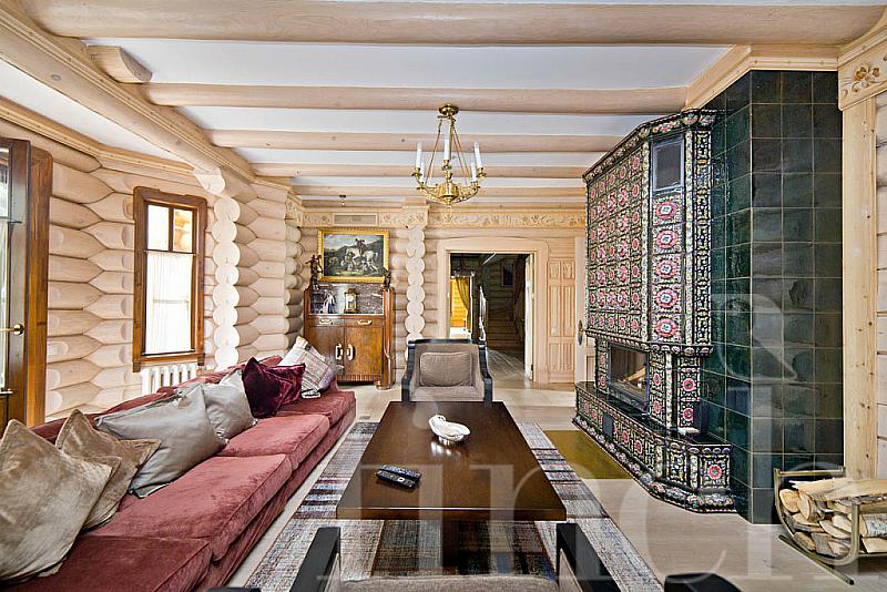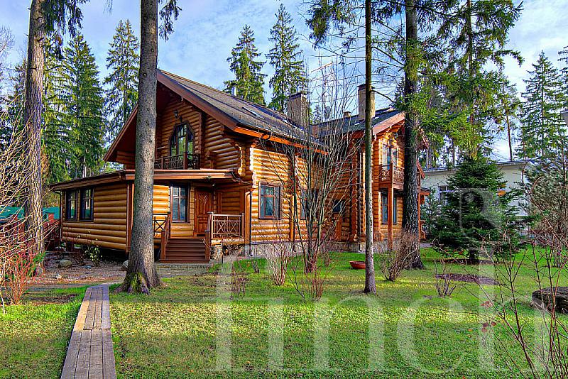 Дом из оцилиндрованного бревна с дизайнерской отделкой и мебелью на лесном участке с прекрасно выполненным ландшафтом.